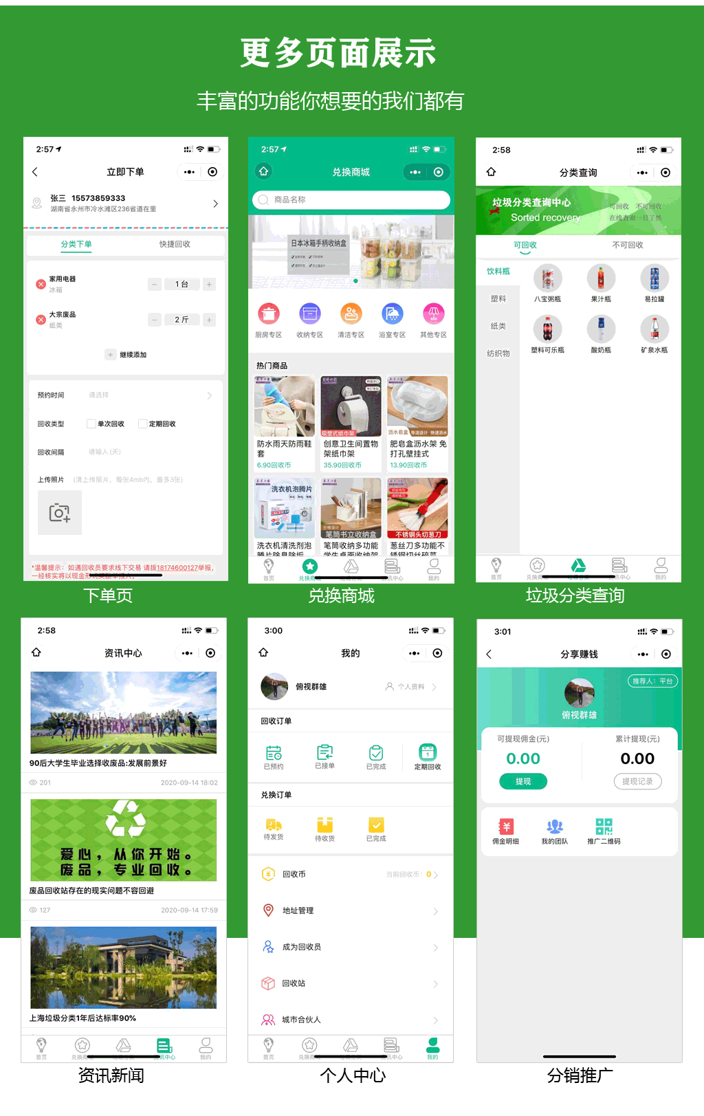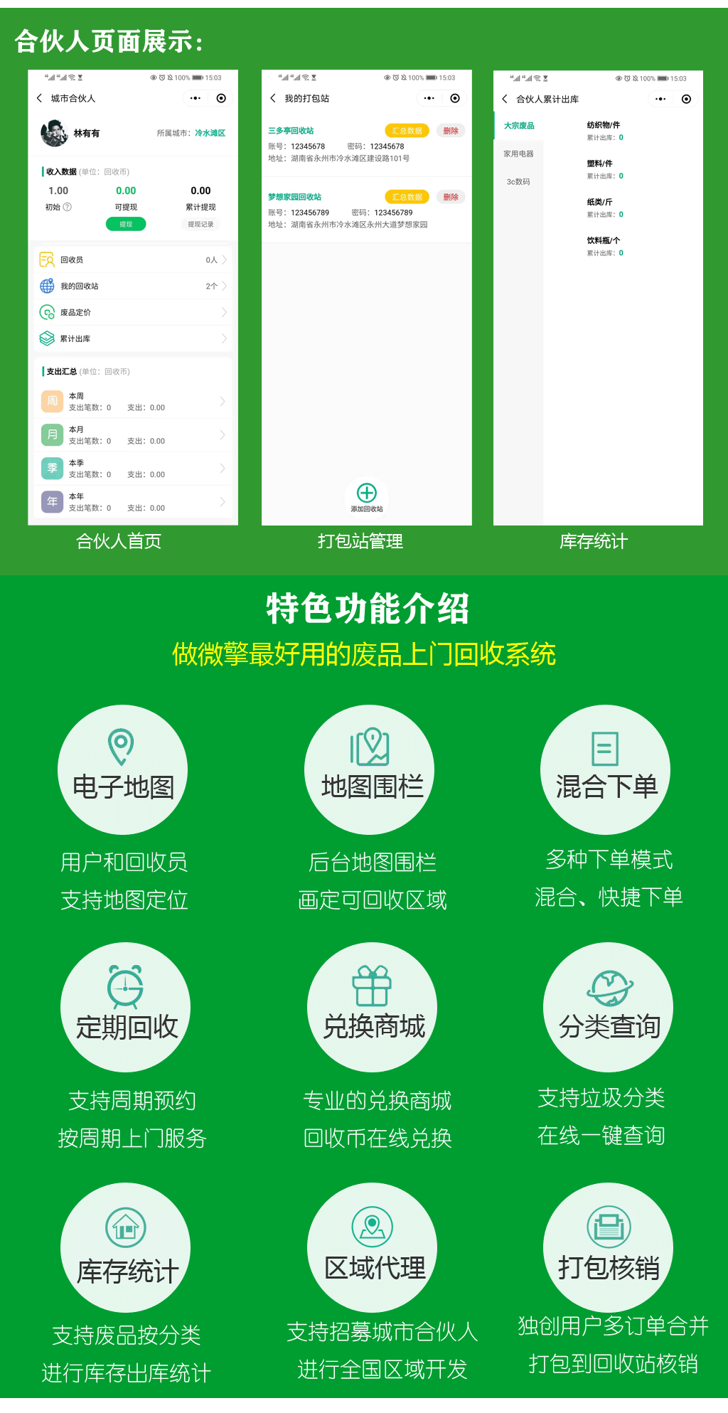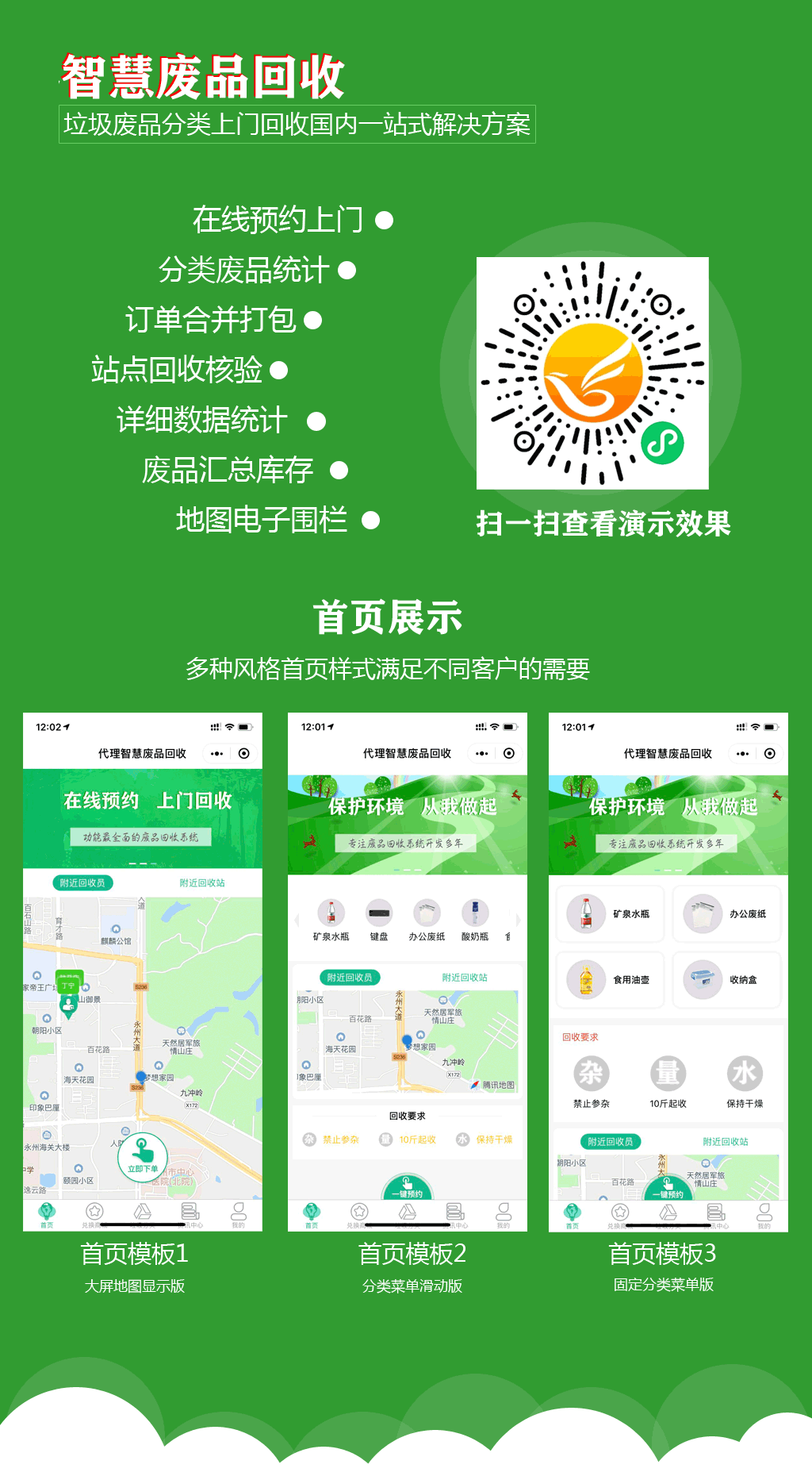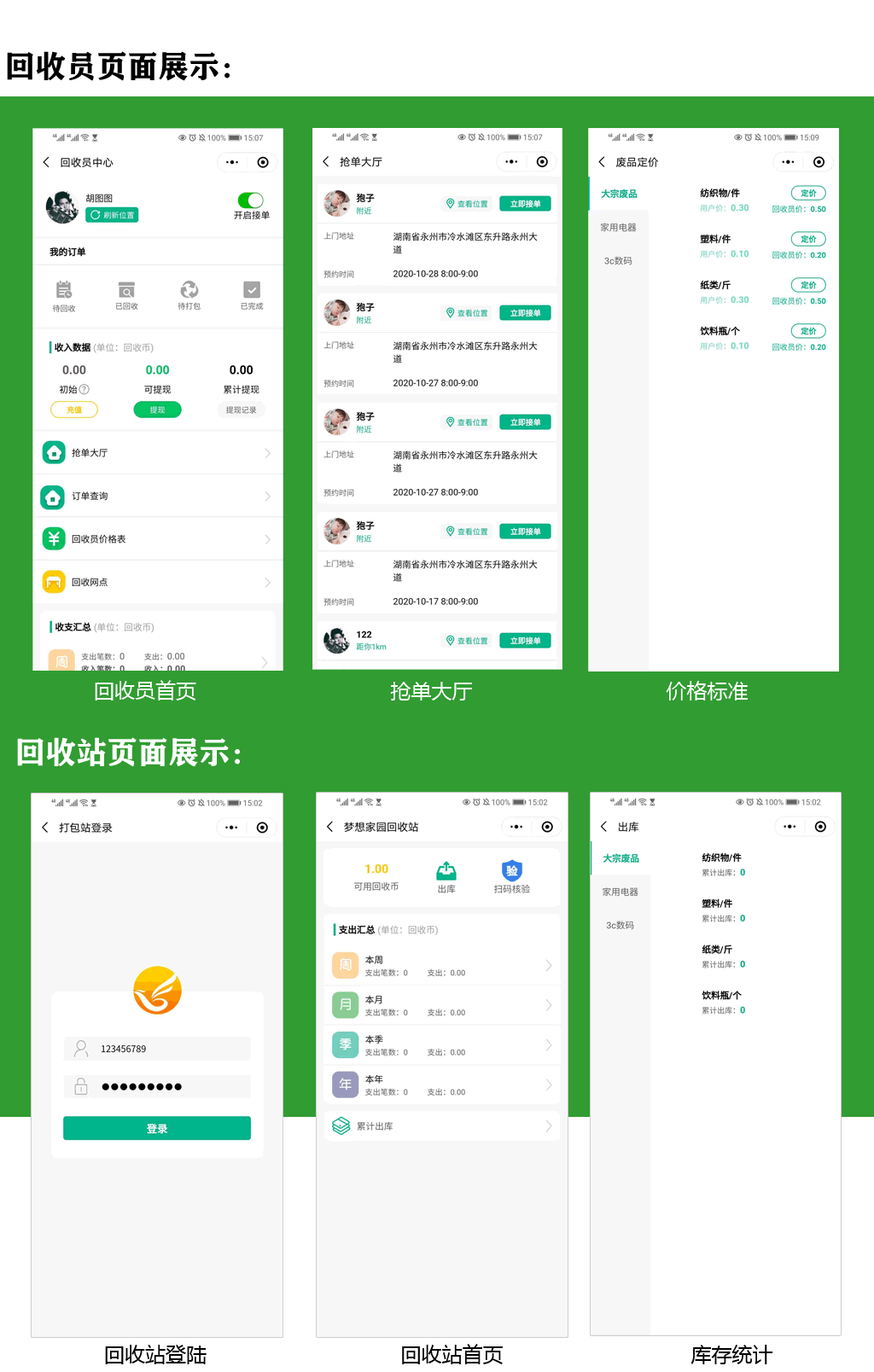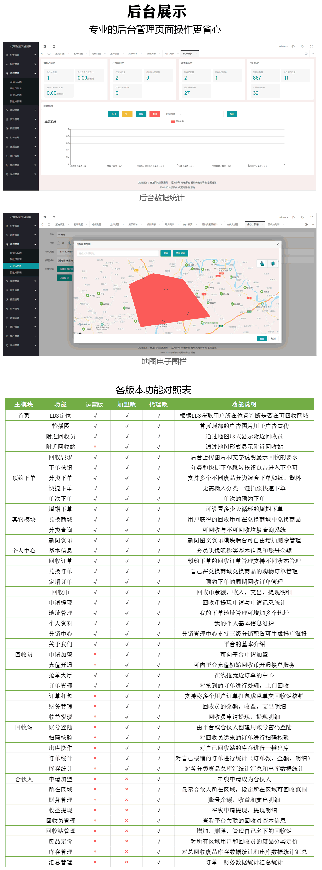 1、線上上門回收:不需要硬件設(shè)備,不需要建立投遞流程,全部上門回收,不需要環(huán)保回收袋,只是每次上門回收的時(shí)候,用戶掃碼綁定下訂單,回收后的數(shù)據(jù)由后臺(tái)進(jìn)行錄入上傳,再反饋到用戶端數(shù)據(jù)展示及其他操作。