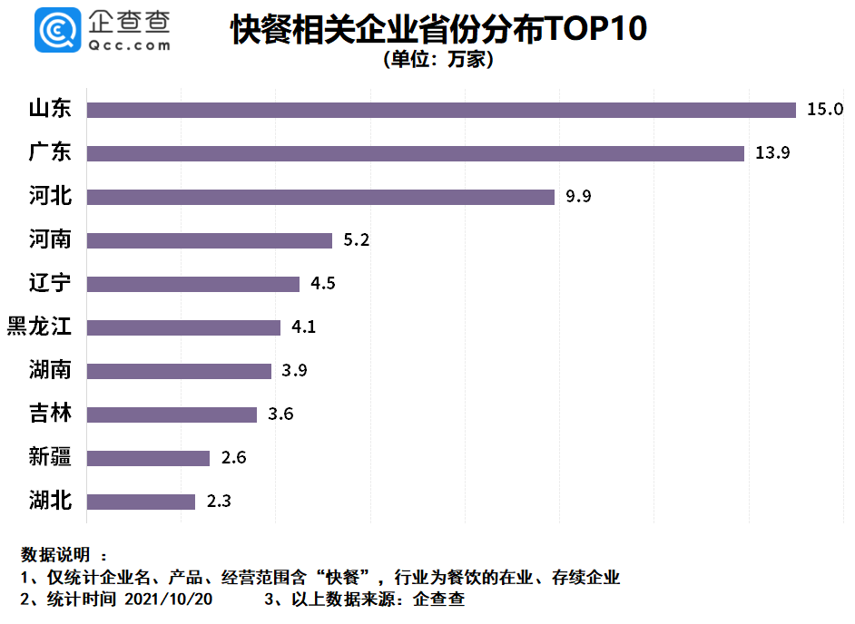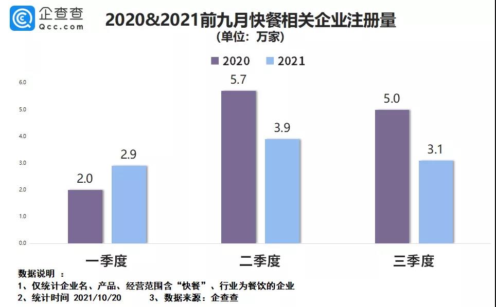 從今年的注冊量來看,2021年前九月,我國快餐相關企業注冊量為9.9萬家,同比下跌了22.0%。從各季度注冊量來看,今年一季度、二季度、三季度的注冊量分別是2.9萬家、3.9萬家、3.1萬家。