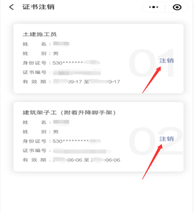辦理個人證書(住房和城鄉建設行業技能人員職業培訓合格證、專業人員崗位培訓考核合格證)注銷業務。(注:辦理個人證書業務前,請先確保已在小程序完成實名認證,并上傳個人簽名及證件照片,上傳簽名及證件照步驟詳見本說明八、十一)